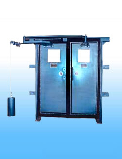 本手動無壓風(fēng)門由門框、門扇、平衡機構(gòu)及配重等部分組成。